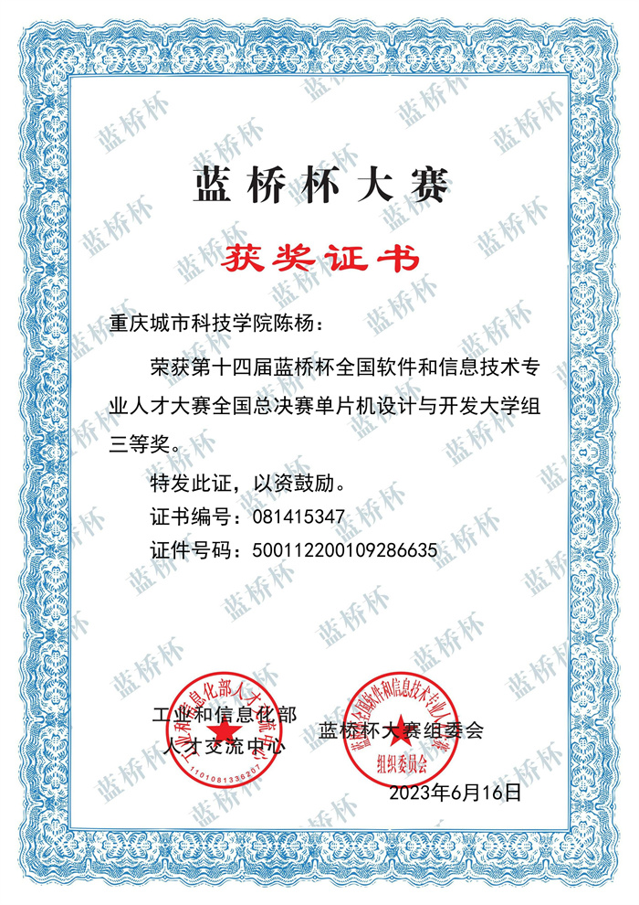 6月10日,第十四届“蓝桥杯”国赛在重庆邮电大学拉开序幕。电气工程学院陈杨作为我校学生代表参加该比赛,经过五个小时的角逐,喜获单片机设计与开发大学组全国三等奖。
