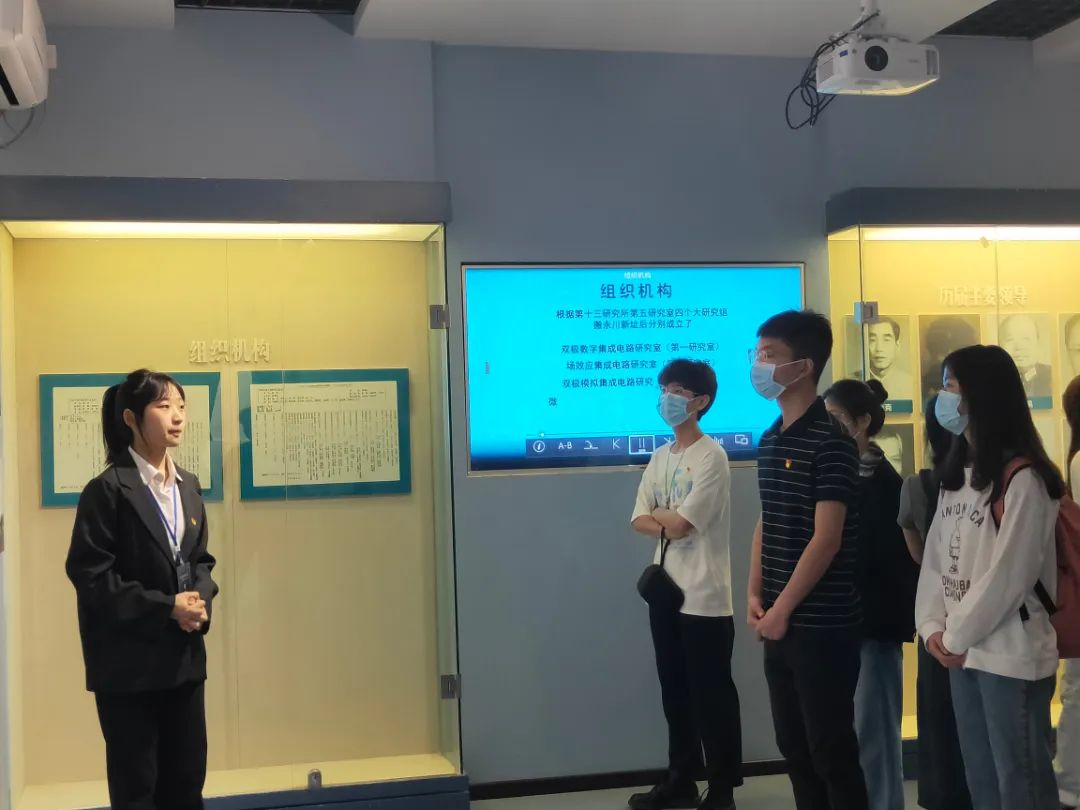 到了主题展馆,讲解员讲解了位于重大城市科技学院内的中国集成电路创业史陈列馆是国内唯一一所宣传展示我国集成电路创业发展历史的陈列馆,这里曾是原中国人民解放军第一四二四研究所旧址,也是我国第一块大规模集成电路诞生的地方。