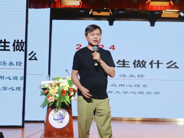 专家引领,剖析心灵成长轨迹。本次讲座特邀西南大学心理学部教授、高级婚姻家庭咨询师汤永隆教授作为主讲嘉宾。汤教授以其深厚的学术功底和丰富的实践经验,围绕“大学生做什么?”这一主题,从社会适应、学习心理、社团活动、亲密关系以及未来规划等多个维度,深入浅出地剖析了大学生在成长过程中可能遇到的心理困惑与挑战,并提供了切实可行的解决策略。他的讲解既具有理论深度,又贴近学生实际,赢得了在场新生的阵阵掌声。