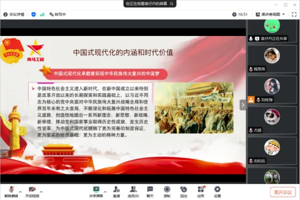 会议伊始,袁仔丹同学以“青春为中国式现代化挺膺担当”的时代背景、深刻内涵等方面为切入点,带领全体成员共同探讨了青年在中国式现代化进程中的重要使命与践行方式,她着重强调,当代大学生应该将青春担当意识融入日常并付诸行动,提升自身能力,以创新思维和扎实本领武装自己,坚定不移地为中国式现代化建设贡献力量。