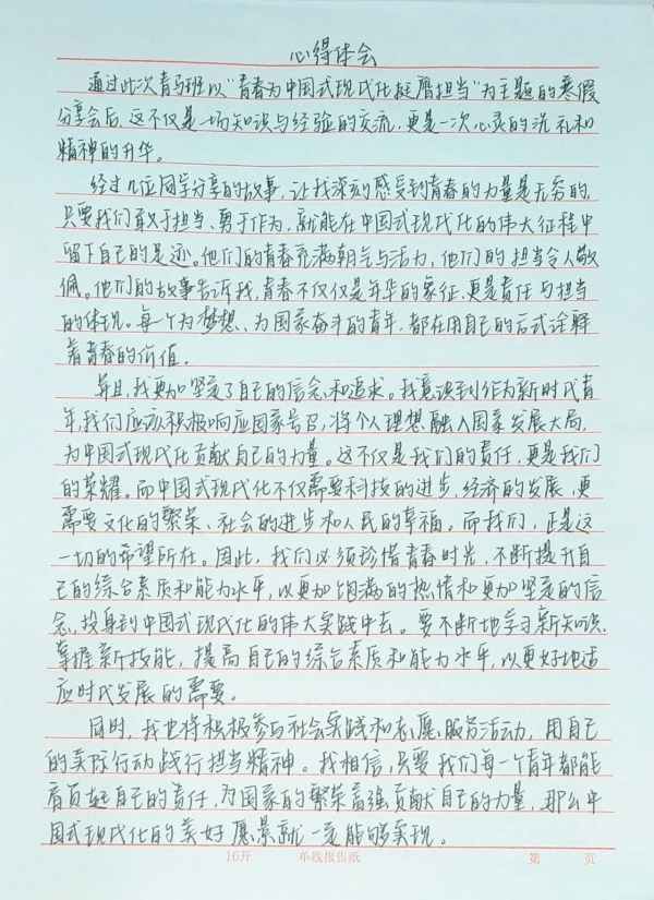 随后,向敏同学分享了黑龙江的热血青年00后博士生周洋研发智能冲锋衣,推动冰雪文旅新潮流的案例。她表示,作为新时代青年,应当大胆创新,勇于攻克技术难题,用行动让中华民族伟大复兴的中国梦绽放异彩。接着,罗亚男、袁仔丹同学分别从文化传承与科技创新的角度展开讨论,分享青年如何借助新媒体平台,让传统文化在新时代重焕生机。她们提出,青年要扎根基层,凭借创新成果突破“卡脖子”技术瓶颈,以切实行动打破城乡发展障碍,为中国式现代化的全面均衡发展添砖加瓦。