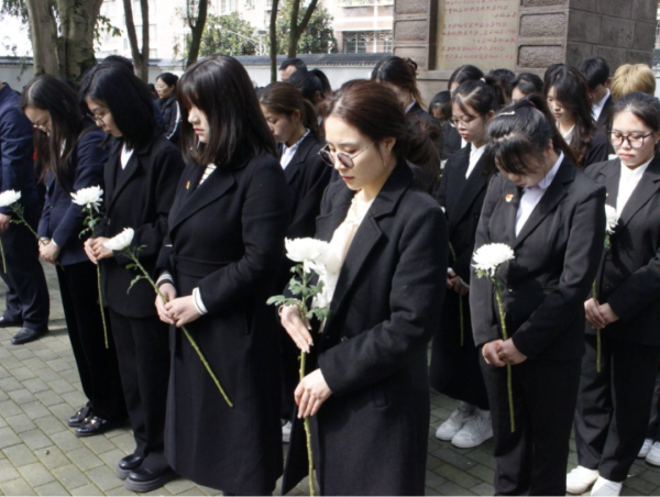 师生代表列队走向烈士纪念碑,敬献花圈并整理缎带,肃穆的仪式承载着对英魂的无尽哀思。全体人员集体默哀三分钟,静默中唯有微风轻拂衣角,时间仿佛凝固于对先烈的追忆。默哀结束,师生手持白花依次献于碑前,白花映照师生心灵的纯净,更象征着先烈精神与今人信念的悄然相融。这既是对历史的深切缅怀,更以庄重仪式凝聚传承之志,激励后人赓续红色血脉。