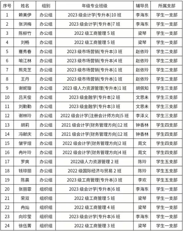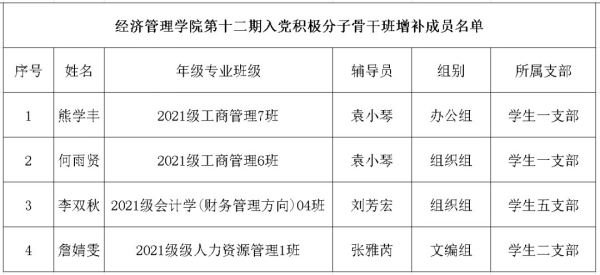 为加强入党积极分子教育培养工作,引导入党积极分子自觉提高思想觉悟、提升党性修养,进一步发挥基层党组织战斗堡垒作用。根据《中国共产党普通高等学校基层组织工作条例》和《经济管理学院学生党员骨干班暨入党积极分子骨干班管理方法》之相关规定,结合我院实际,经本人申请、资格审查、公开竞选、支部推荐、综合考察等选拔程序,经管党总支研究决定,拟定熊学丰等4名同学为第十二期入党积极分子骨干班增补成员。