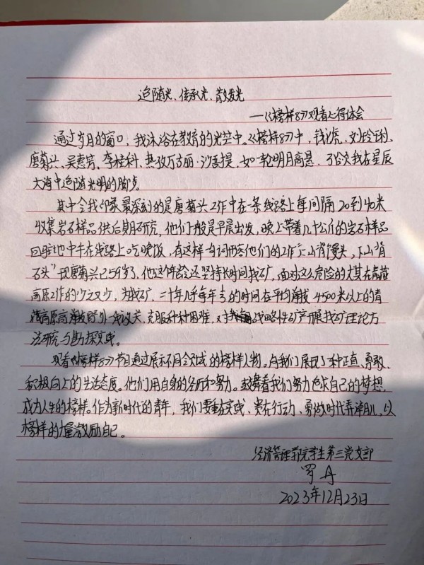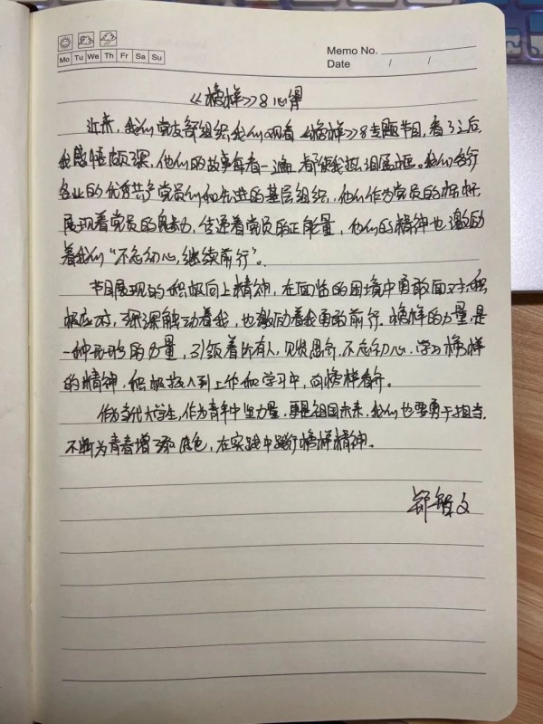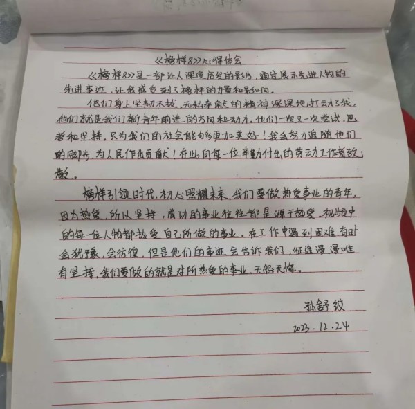 学生党员孙舒纹:榜样引领时代,初心照耀未来。节目中的每一个人都在热爱自己所做的事业,我们也要做热爱事业的青年,尽管在工作中遇到困难无法避免感到犹豫与彷徨,但就如这几位榜样一样,征途漫漫,唯有坚持,我们才能对热爱的事业感到无怨无悔。