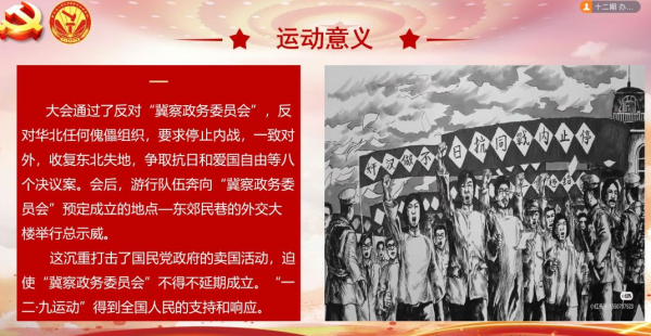 重温红色经典,凝聚奋进之力。会议伊始,曾丽蓉同学以相关视频及历史资料为切入点,详细介绍“一二·九爱国运动”的背景及其经过,她指出日本帝国主义占领东北后,把侵略的魔爪进一步伸向华北,妄想把华北变成第二个东北。在中华民族面临生死存亡的严重危机之际,北平大学生冲破国民党军警的阻拦,举行示威游行,高高昂起不屈的头颅,喊出内心深处的吼声,就是这阵阵怒吼,唤醒了沉睡着的中国人民。他们以实际行动展示了青年的热血豪情,以大无畏的勇气诠释了青年的责任担当,作为肩负使命的青年一代,更应肩负历史重任,厚植爱国情怀,用内心感应时代脉搏、用汗水凝聚时代力量,争做“肩上有担,心中有责”的新时代好青年。