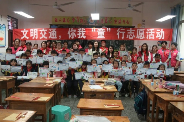 紧接着志愿者们带领同学们学习关于交通安全的手势舞,以活泼生动有趣的形式让小朋友们记住交通安全的规则。在“文明交通,珍爱生命”的讲解中,迎来最令人期待的有奖问答。同学们积极参与其中,以充实的交通知识为自己赢得了奖品,欢声笑语一堂,将本次志愿活动的氛围推向了高潮,有奖问答结束后,志愿者和小朋友共同执笔,绘画交通安全线稿,图画跃纸上,安全记心中。最后全体同学及志愿者进行合影留恋。