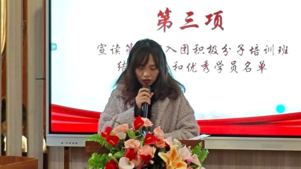 学院团总支书记龚宇梦宣读第七期入团积极分子培训班结业名单,并向顺利完成学业的同学们致以热烈的祝贺。她鼓励所有学员积极投身于团组织的各项活动中,通过实际行动展现自己的青春活力和对社会的贡献;她希望同学们能时刻以共青团员的标准严格要求自己,早日成长为具备责任感、怀抱理想、勇于担当的新时代青年。