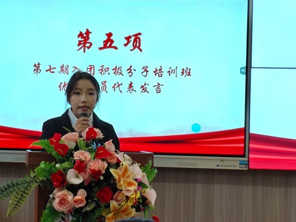 第七期入团积极分子培训班优秀学员代表张元婷同学发言,她全面回顾了自己在入团积极分子培训班中的成长经历,分享了自己在思想觉悟、学业成绩和团队协作方面所取得的成就。她表示入团积极分子要坚定理想信念,努力做好一名有理想、敢担当、能吃苦、肯奋斗的新时代好青年;她期待能与大家在共青团旗帜下,为国家的繁荣昌盛、民族的伟大复兴贡献青春力量。
