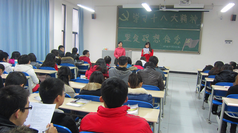 2012年12月4日下午4点,2010级会计学7、8班同学围绕 “十八大”会议精神,结合实际,在新教204开展了 “学习十八大精神,坚定理想信念”的主题班会。两班共61名同学参加。