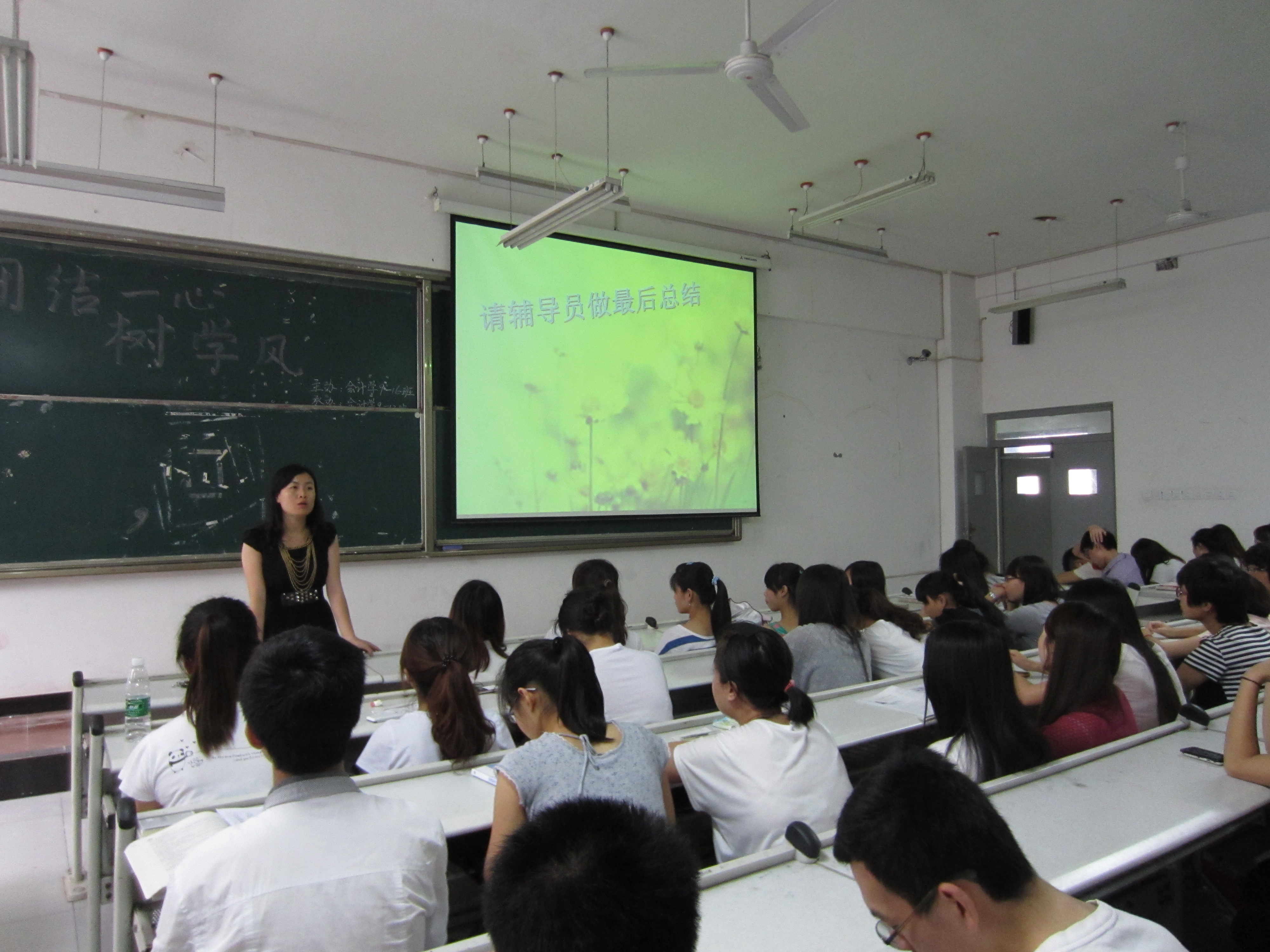 2011级会计学9—16班于5月15日13点30分,在主教111举行了学风建设主题班会。辅导员刘娟老师为此次班会的嘉宾。此次主题班嵊�9班团支书杨果主讲,11班团支书孙若溪主持。