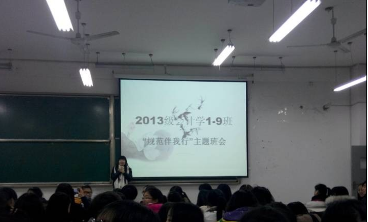 2014年2月25日晚8点30分,2013级会计学专业1-9班全体同学在魏巍老师的带领下召开了“规范伴我行”的主题班会,并提出“立志,拼搏,成功”六字方针对同学们进行了新学期的思想教育。