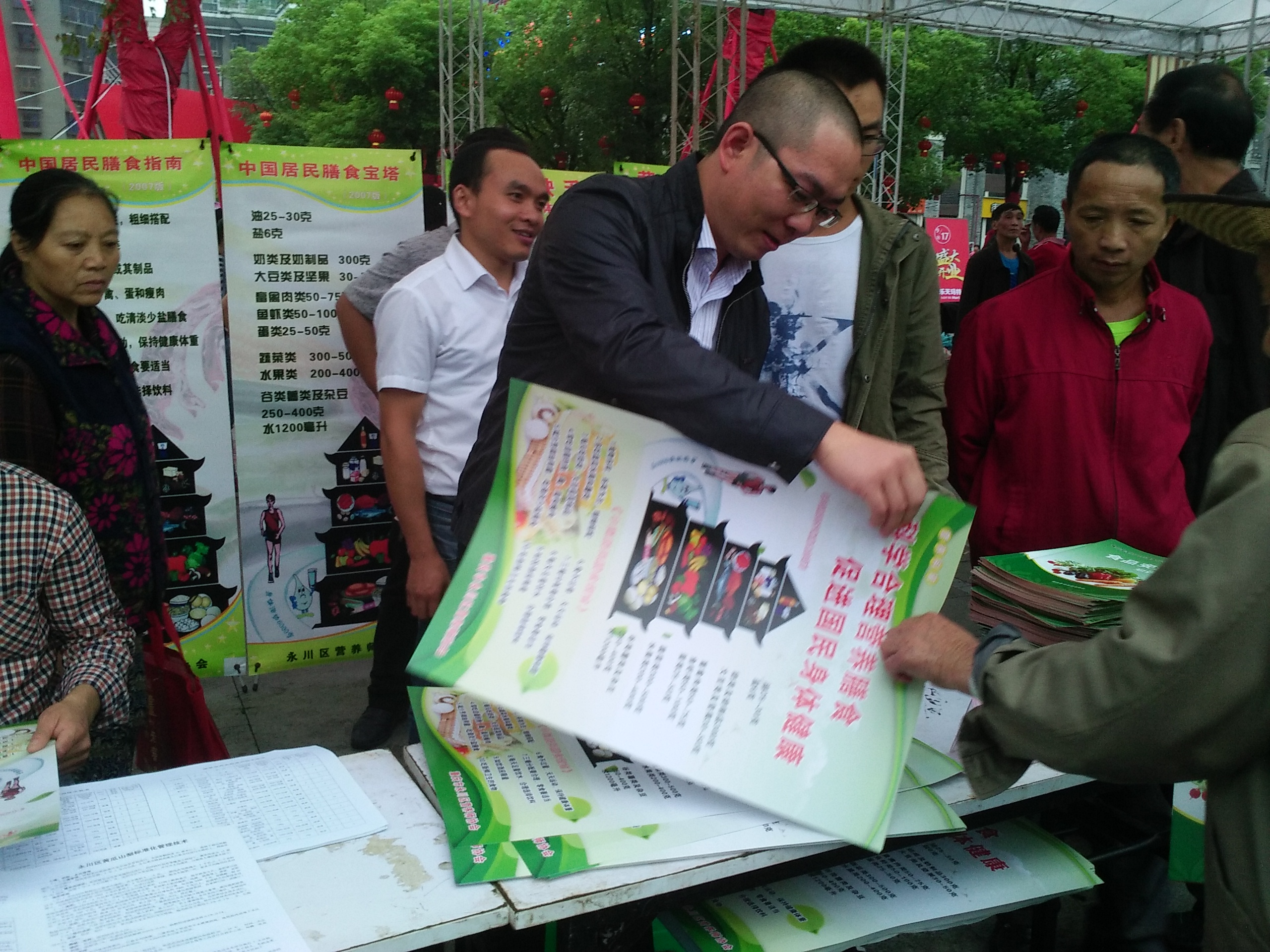 9月20日上午,以“创新发展、全民参与”为主题的永川区2015年“全国科普日”活动在文曲广场隆重举行。市科协副巡视员汤庆华、区人大常委会副主任王晓英、区政协副主席高志强等参加启动仪式。活动当天,重庆大学城市科技学院营养与健康学会受永川区营养师协会邀请,在文曲广场向全区市民宣传普及营养与健康知识。在学会指导老师李晓飞的带领下,会员代表们早早达到了活动地点,积极配合永川营养师协会向全区市民发放营养与健康宣传手册,普及平衡膳食、饮食营养等健康知识。活动中市民们对学会发放的营养健康宣传手册非常感兴趣,积极踊跃地领取,同时也向我们咨询了许多营养保健的相关问题,我们都一一的为大家做了解答,在展台前参观和咨询的市民一直络绎不绝。活动一直持续到上午11时许圆满结束。