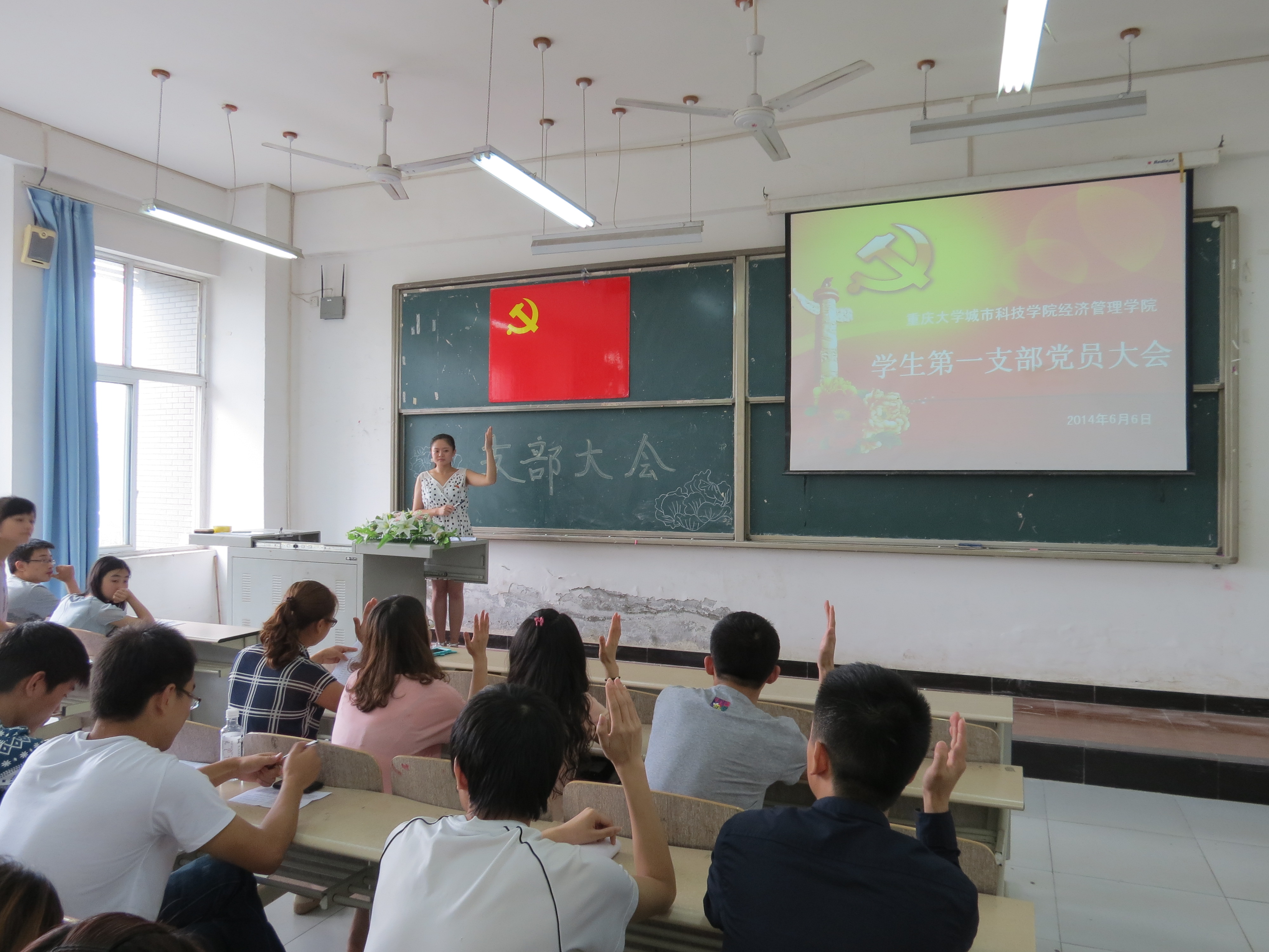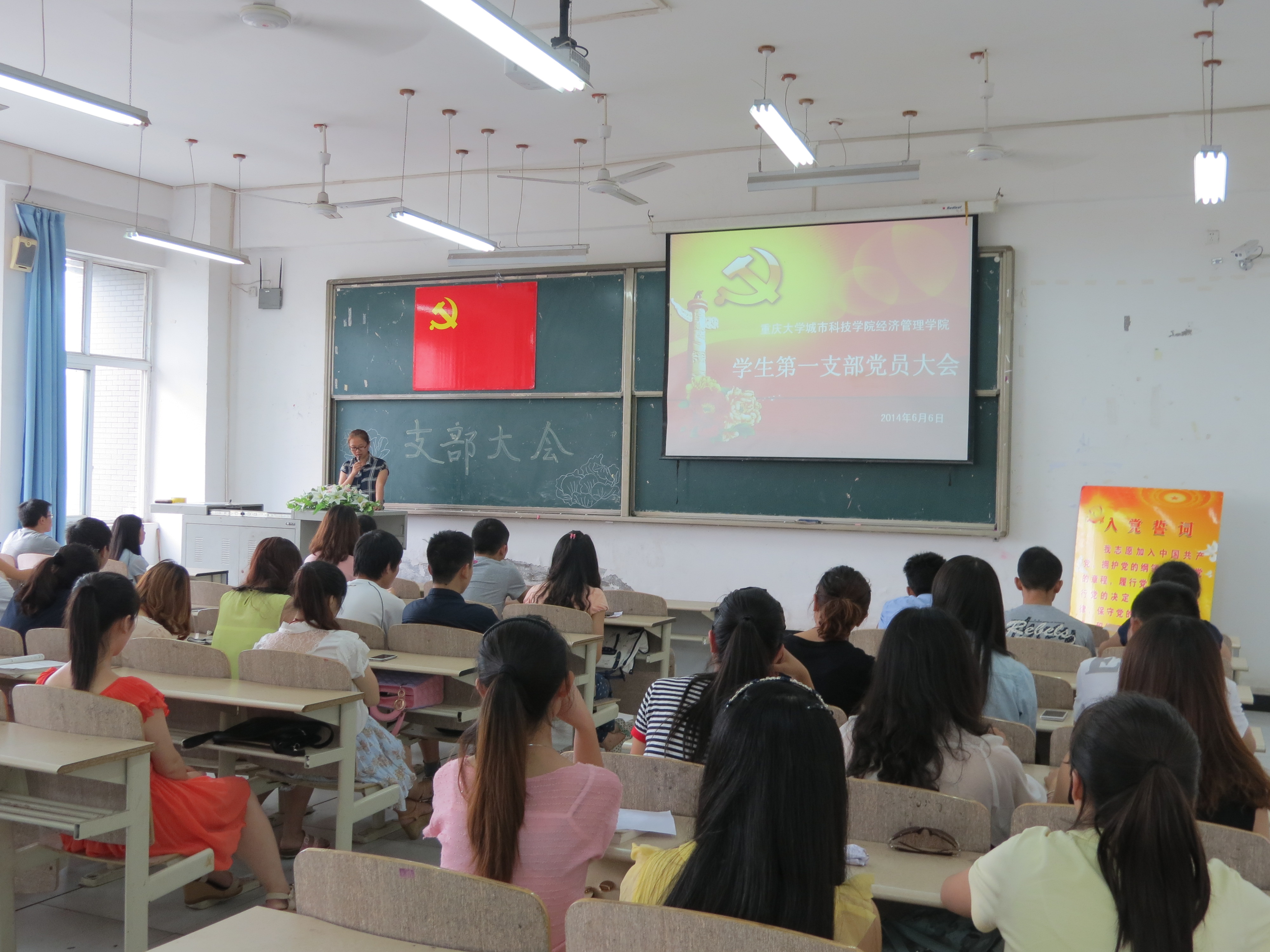 本次大会主要有七项议程:首先,全体党员起立奏唱国际歌;其次,喻思洋等12名发展对象依次向在座党员同志汇报考察期间自身情况、入党介绍人发言、正式党员举手表决、支部副书记张念老师宣布了表决结果,并对新成员的加入表示祝贺。接着由徐秋怡同志带领本次发展为预备党员的同志进行入党宣誓。在庄严的宣誓之后,我支部继续讨论了赵兀华等两名同志转正问题,经过预备党员依次上台阐述自己预备期间表现及考察人、其他党员发表意见后,正式党员进行举手表决,最终全票通过。
