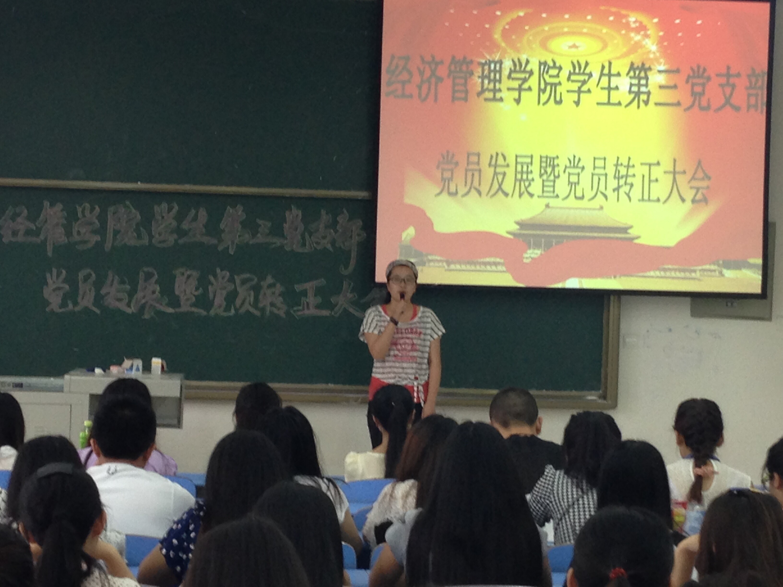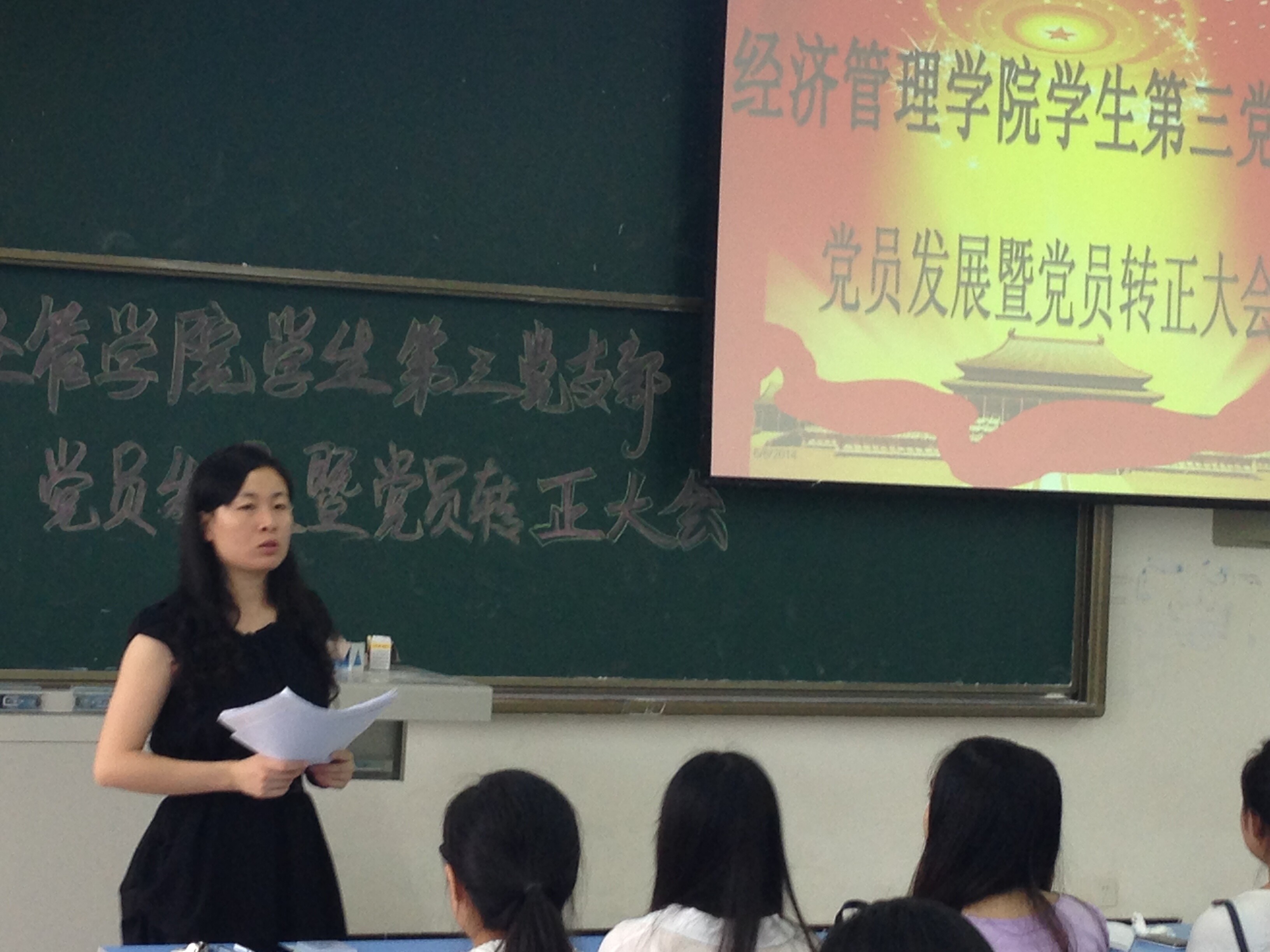 经济管理学院第三党支部发展党员暨预备党员转正大会于6月6日9:30在6教213如期举行。第三党支部书记刘娟及各委员出席了此次会议,全体学生党员及预备党员参加了本次会议。会议由党支部书记刘娟主持。