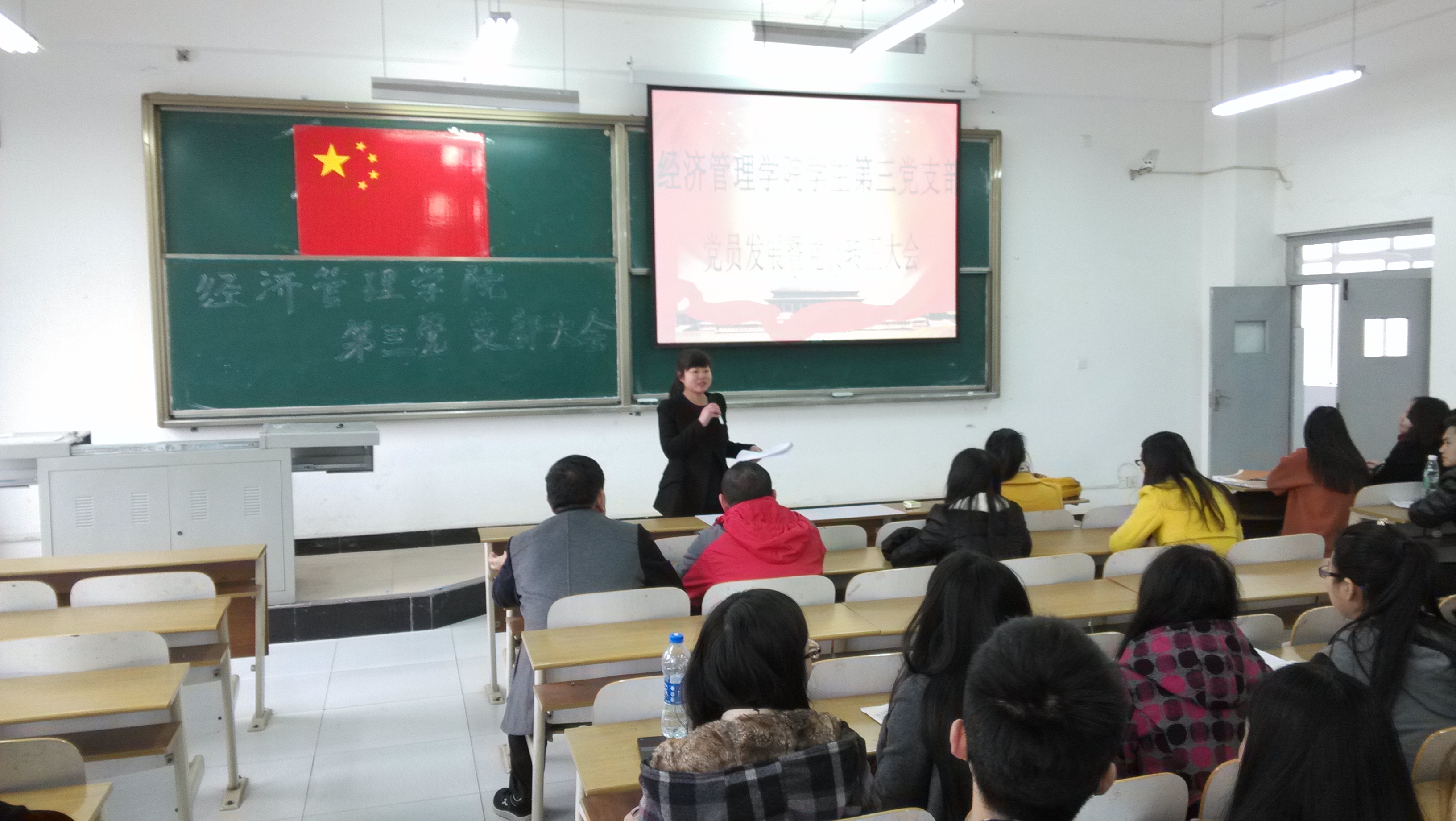 2014年12月8日,经济管理学院学生第三党支部发展党员暨预备党员转正大会在主教509举行。第三支部书记刘娟老师、组织委员邓燕老师、魏巍老师和全体党员参加了此次会议。会议由支部组织委员邓燕老师主持。