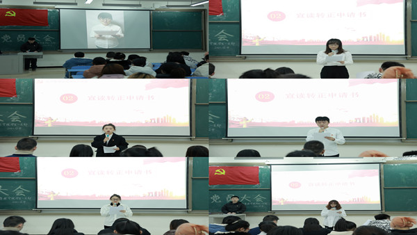 会上,周芸宇等6名同志分别宣读转正申请书,在大会上向参会人员汇报自己一年考察期内思想、学习、工作和生活等方面的情况,并指出了自己的不足,表明在未来会继续坚守初心,坚定信念,不断学习改正,切实解决自身存在的突出问题,实现自我革新、自我提高,用实际行动来证明自己的入党初心。