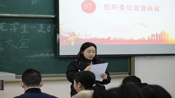 为加强党员队伍建设,进一步规范党员发展流程,从源头上保证党员的先进性、纯洁性,发挥党员的战斗堡垒作用。2021年12月14日,经济管理学院学生一支部于六教207召开党员发展大会,大会讨论关于石夏梅等27名同志转预备党员相关事宜。支部书记胡威、组织委员余婕妤、全体党员及入党介绍人参加本次会议。文闻同志主持会议。