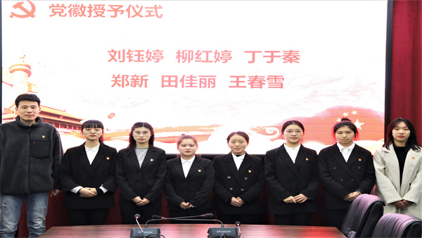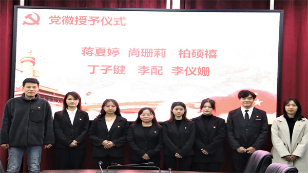 首先,由支部书记张峻铭和支部副书记唐华阳为22名新发展党员佩戴党徽并合影留念。