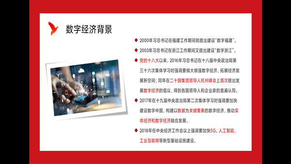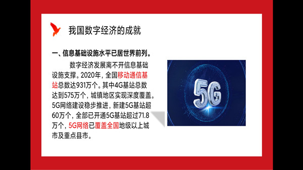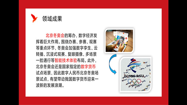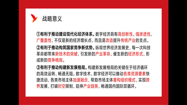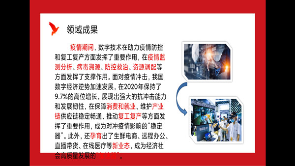 奋勇争先谋经济,稳中求进促发展。接着,在袁孝森同学的带领下,从信息基础设施水平、电子商务发展、移动支付、新模式新业态等方面对我国数字经济的成就进行了阐述。他谈到,发展数字经济意义重大,是把握新一轮科技革命和产业变革新机遇的战略选择,有利于推动建设现代化经济体系、构筑国家竞争新优势、构建新发展格局。数字技术、数字经济在支持抗击新冠肺炎疫情、恢复生产生活、北京冬奥会的筹办等方面都发挥了重要作用。数字经济的发展,是激励学生党员和入党积极蓬勃向上的强大动力。