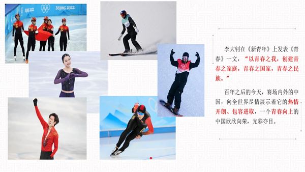 接着,团支书蒲雅婷引用了李大钊先生在《青春》一文中提到的“以青春之我,创建青春之家庭,青春之国家,青春之民族”的名句带着我们进入了“以青春筑梦想,用奋斗谱华章”的部分。看到为中国在冬奥会夺得首枚金牌的短道速滑队,刷新男子速滑500米记录的世界冠军高亭宇,浴火重生的金博洋,从“翊”鸣惊人的苏翊鸣到一飞冲天的谷爱凌等怀揣梦想,勇敢追梦的有志青年,不断地燃烧自己的青春,为国家的荣誉而奋斗,让世界看到属于中国青年的朝气与蓬勃。不禁让人感叹“青年一代有理想、有担当,国家就有前途。民族就有希望,实现中华民族伟大复兴就有源源不断的强大力量。”百年之后的今天,赛场内外的中国,向全世界尽情展示着它的热情开朗、包容进取,一个青春向上的中国欣欣向荣,光彩夺目。
