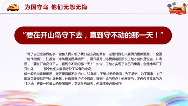 本次理论学习主要由4名入团积极分子分享了王继才、江梦南、吴天一、袁隆平四位先锋模范的故事。自1986年起,王继才和妻子王仕花守卫孤岛整整32年直至2018年,他被誉为全国“时代楷模”。王继才同志为党和人民国防事业献出了宝贵生命,诠释了共产党员的使命与担当,他的甘奉献、爱国防、敢担当的精神,值得我们新一代青年学习。