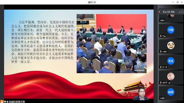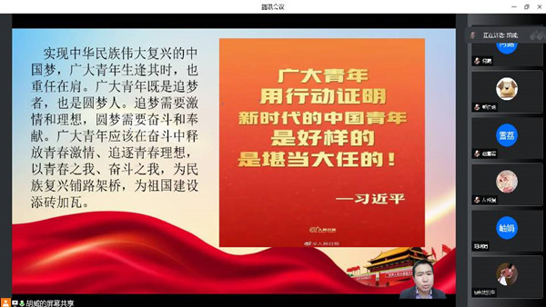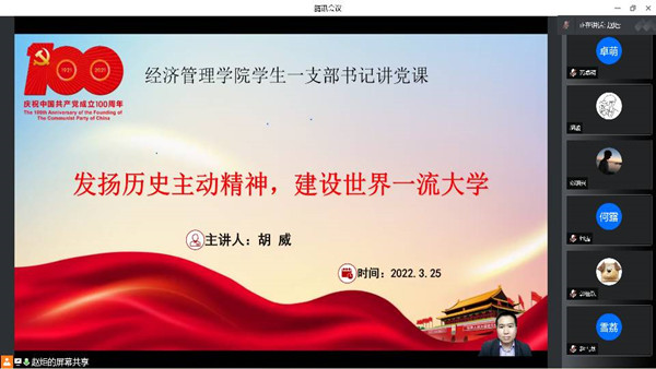 为深入贯彻落实党的十九届六中全会中“伟大的历史主动精神,体现中国共产党人的精神品格”的理念,积极带领支部党员学习主动精神、创新精神、实践能力,提升综合素质能力。3月25日中午,经济管理学院学生一支部于腾讯会议召开以“发扬历史主动精神,建设世界一流大学”为主题的党课。此次党课由胡威书记主讲,支部全体党员参加。