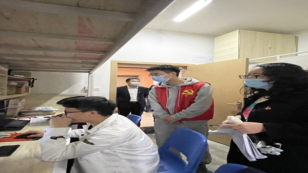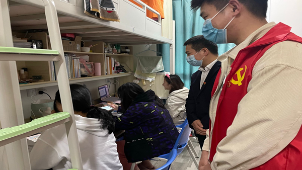 党员走访宿舍,了解学习情况。进入学生宿舍,各位党员同志认真细致摸排学生实际需求,汇总学生所遇到的问题,亲切地与同学们交流近期思想、学习以及生活等情况。胡威书记表示,当前疫情形势依然严峻,同学们要严格遵守学校防疫规定,自觉做好个人防护。2021级辅导员蒋红艳也强调同学们要按时进行线上教学,自觉配合教师开展教学。