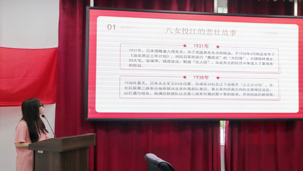 八女英魂,光照千秋。随后,支部党员宋禹红同志带领大家共同了解八女投江的革命故事,她谈到,八位抗联女战士面对敌军不畏牺牲、英勇投江,展现出共产党员崇高的民族气节和视死如归的革命斗争精神,她们将爱国精神诠释淋淋尽致,她们在用生命保家卫国。作为一名学生党员,我们更应该传承党的的优良作风,赓续党的优良传统,自觉将爱国精神内化为民族自信,外塑成实践自觉,以传承不息的“红色薪火”砥砺党员初心,把好人生“总开关”,对党忠诚。
