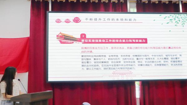 同心共战“疫”,彰显党员政治本色。金杰同志通过分享“疫情无情,人间有情”的抗疫英雄故事,向全体党员传递着“生命至上、举国同心、舍生忘死、尊重科学、命运与共”的伟大抗疫精神。作为新时代的答卷人,我们要在抗击疫情的大战中践行初心使命,展现共产党人政治本色,以责任担当之勇、科学防控之智、统筹兼顾之谋、组织实施之能,全心全意为人民服务,大力弘扬伟大抗疫精神,不断创造中华民族新的历史辉煌。