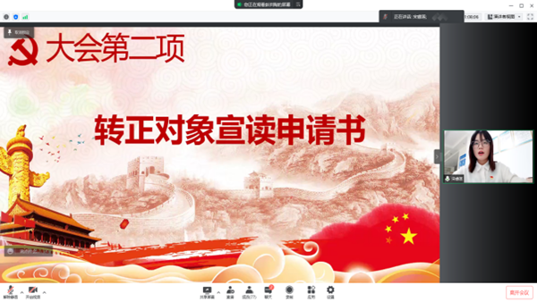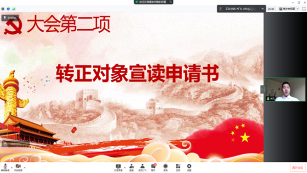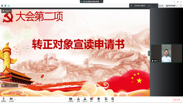 随后,部分待转正预备党员的入党介绍人因公不能到场,委任支部党员同志代为宣读考察意见,并向党组织表明对其如期转正的意见和建议。与会党员同志们对冉飞等15位预备党员同志能否如期转正申请进行了充分讨论,由宋承洁同志担任计票人,张峻铭同志担任监票人,采用无记名线上投票的方式对预备党员进行投票表决。在统计票数后,由支部副书记唐华阳公布表决结果,同意冉飞等15位同志如期转为中共正式党员。