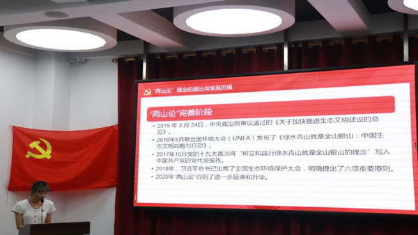 史燕洁同志向大家详细讲解“两山论”,加强了全体党员对习近平同志经常讲到的“绿水青山就是金山银山”发展理念的理解。她谈到,没有革命的理论,就没有革命的行动,两山论现在已经成为我们党的重要执政理念之一,生态文明也被纳入到中国共产党的行动纲领之中,在以“绿水青山就是金山银山”的核心理念下,一个青山常在、绿水长流、空气常新的美丽中国正在绘就。作为共产党员的我们,也应该理论结合实践,贯彻落实党的指令,以青春之我,建设青春之政党、青春之民族、青春之国家。