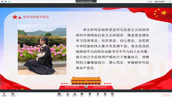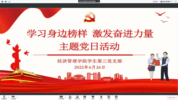 为进一步营造“学榜样、强学风、争上游”的校风学风,紧握先进榜样的接力棒,传递榜样的正能量,引领广大青年学子励志笃行,发愤图强。6月26日中午,经济管理学院学生第三党支部于腾讯会议开展“学习身边榜样,激发奋进力量”主题党日活动。本次活动由李宏伟同志主持,支部全体党员参加。