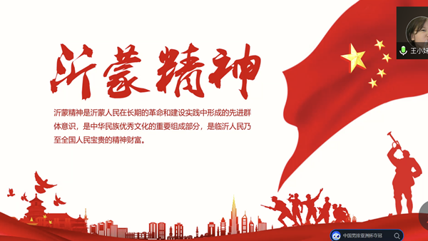 感悟沂蒙精神,传承文明薪火。会议伊始,王小妹同志结合图文、视频等形式向大家详细介绍了沂蒙精神的主要内涵。沂蒙精神是沂蒙人民在长期的革命和建设实践中形成的先进群体意识,是中华民族优秀文化的重要组成部分,是全国人民宝贵的精神财富。她讲到,对我们来说,沂蒙精神体现了党全心全意为人民服务的宗旨,是党和国家的宝贵精神财富,我们应不断结合新的时代条件和自身实际行动,时刻铭记沂蒙精神,代代传承群众路线。