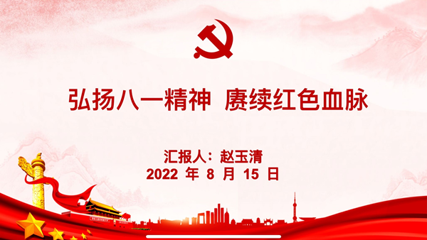 弘扬八一精神 赓续红色血脉。随后,赵玉清同志以建军节的由来及诞生为始,带领大家学习了八一精神的历史地位和时代价值。她提到:八一精神铸就了人民军队的军魂,彰显了红色文化的精髓,构筑了文化自信的基石。在当下,作为一名党员,应自觉坚守初心本色,传承红色基因,争当英雄传人,以真切的感情深刻理解“八一精神”,在感悟思想之源中汲取奋进的力量,续写新时代中国特色社会主义事业新篇章。