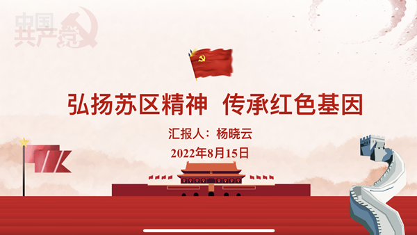 传承苏区精神,弘扬红色基因。紧接着,杨晓云同志以《习声回响》视频为切入点,带领大家深刻理解以坚定信念、求真务实、一心为民、清正廉洁、艰苦奋斗、争创一流、无私奉献为主要内涵的伟大苏区精神。苏区精神承载着中国共产党人的初心和使命,是无数革命先辈用鲜血和生命铸就成为中国革命史上一座不朽的丰碑,跨越时空、永不过时,成为了共产党人砥砺前行的不竭动力。作为新时代党员,我们要坚持继承先烈遗志,大力弘扬苏区精神,谱写全面建成社会主义现代化强国,实现中华民族伟大复兴的中国梦的崭新篇章。