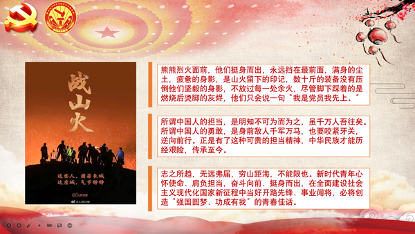 挺身而出为群众,勇于担当心向国。随后,向柳阳同学通过讲解山火爆发之际的感人瞬间,向骨干班成员们详细地介绍了不畏艰险、一往无前的川军精神。作为新时代青年大学生,我们必须肩负担当,背负目标与希望,以奋斗筑梦未来。