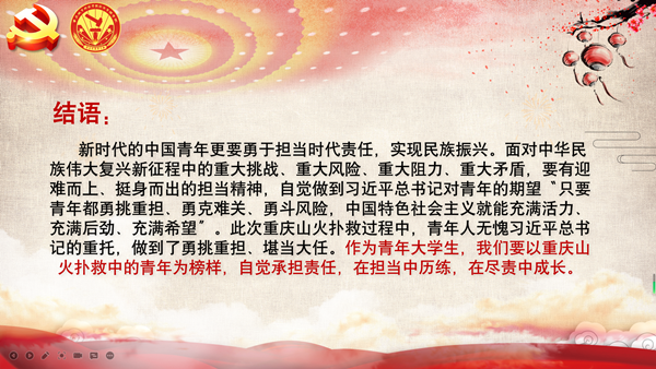致敬烈火英雄,弘扬铮铮气节。紧接着,幸弋倪同学通过围绕“重庆多地突发山火,众志成城昼夜鏖战”这一话题带领大家一起学习烈火英雄的英勇气概。她讲到,重庆山火的逆行者们舍生赴火,冲锋在前,他们以生命赴使命,以己力护苍生,彰显中国人民的担当作为。作为青年大学生,我们要树立不负人民的家国情怀,追求高尚纯粹的思想境界,为党和人民事业拼搏奉献,争做永不停歇的奋斗者,书写无悔青春。