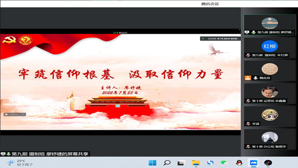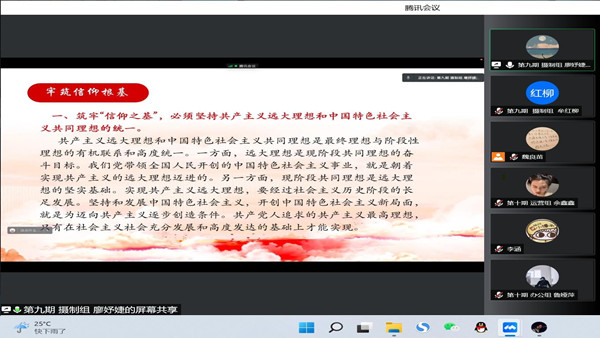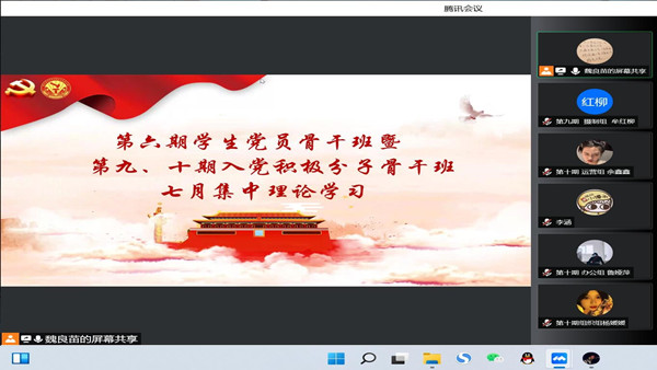 为教育引导广大学生党员从党的百年奋斗中感悟信仰力量,提高党性修养,凝聚党性共识,始终保持顽强意志,勇敢战胜各种重大困难和严峻挑战。7月23日中午,经济管理学院学生党员骨干班暨入党积极分子骨干班于线上(腾讯会议)开展以“牢筑信仰根基,汲取信仰力量”为主题的集中理论学习。本次理论学习由魏良苗同学主持,廖妤婕同学主讲,骨干班全体成员参加。