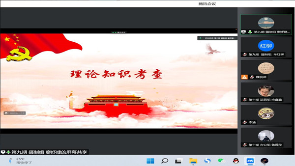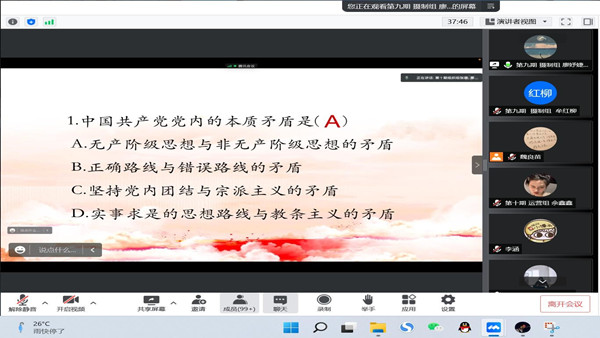 汲取党史力量,夯实学习成果。随后,廖妤婕同学结合本次理论学习的知识点和党史拓展题对参会人员进行党史知识考查,大家踊跃发言,积极抢答,充分展现了大家良好的党史学习态度及丰富的党史理论储备。
