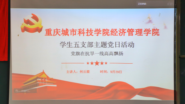 为深入贯彻落实习近平总书记重要指示精神,传承中华儿女不畏艰难,守望相助的家国情怀,引导全体党员深悟抗旱防旱精神,增强新时代青年党员的责任意识。9月29日下午,经济管理学院学生第五党支部采用“线上+线下”相结合的方式,于经管学院大楼211教室开展以“党旗在抗旱一线高高飘扬”为主题的党日活动。支部书记刘芳宏、副书记刘鑫渝及全体党员同志参与,本次活动由何丘霞同志主持。