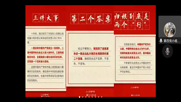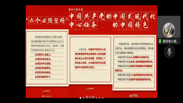 为积极营造学习宣传贯彻党的二十大精神的浓厚氛围,引导支部党员牢牢把握中国特色社会主义新发展阶段的历史方位和时代坐标新要求,以自信自强的姿态昂首前进,奋力擘画民族复兴的伟业宏图。10月27日中午,经济管理学院学生第五党支部于线上(腾讯会议)开展十月政治理论学习。支部书记刘芳宏、副书记刘鑫渝及全体党员同志参加,本次活动由刘思思同志主持。