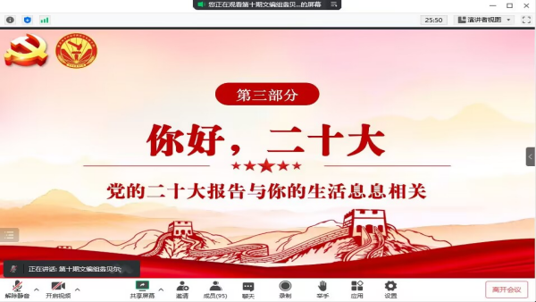 增进民生福祉,厚植幸福根基。紧接着,翁贝尔同学以党的二十大与人民的日常生活息息相关为切入点,带领大家从经济发展、法治、教育、就业、收入五个方面深入学习党的二十大报告精神。她讲到,报告中所提及的“着力解决好人民群众急难愁盼问题”,充分体现出中国共产党满满的民生情怀和为民初心,更是对实现人民对美好生活向往的有力呼应。新时代青年要深刻学习领会党的二十大报告精神,切实把思想和行动统一到报告精神上来,始终牢记习近平总书记的殷殷嘱托,矢志不渝听党话、跟党走。