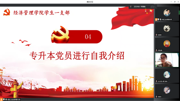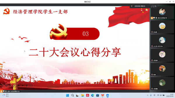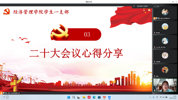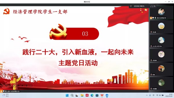 为庆祝党的二十大胜利召开,增强党员荣誉感、归属感、使命感,凝聚党内磅礴力量,坚定马克思主义信仰,全面贯彻党的二十大精神。10月28日中午,经济管理学院学生第一党支部于线上(腾讯会议)组织开展“践行二十大,引入新血液,同心向未来”主题党日活动。支部书记胡威及全体党员同志参会,本次党日活动由周廷玉同志主持。