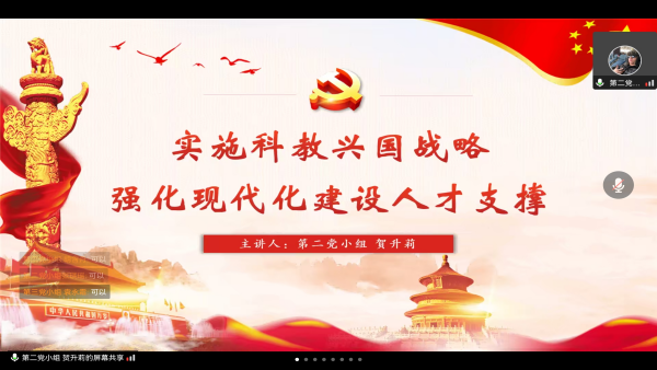 随后,贺升莉同志以“实施科教兴国战略,强化现代化建设人才支撑”为主题进行交流分享。贺升莉同志从“办好人民满意的教育、完善科技创新体系、加快实施创新驱动发展战略、深入实施人才强国战略”等四个方面进行领学。贺升莉同志讲到:新时代是奋斗者的时代,作为青年大学生,我们要有攻坚克难、艰苦奋斗的精神,要将理论学习与实践活动相结合,不断磨练意志,提高技能水平,为强国发展贡献自己的一份力量。