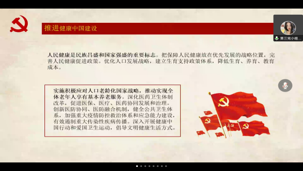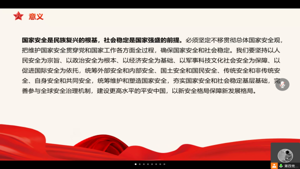 随后,方明月同志通过幻灯片的形式,向大家详细介绍了关于“推动绿色发展,促进人与自然和谐共生”、“推进国家安全体系和能力现代化,坚决维护国家安全和社会稳定”以及“实现建军一百年奋斗目标,开创国防和军队现代化新局面”等三个主要内容。她谈到,当代中国青年生逢其时,施展才干的舞台无比广阔,我们要以高标准,严要求,修身律己,积极响应党和国家的号召,发挥出党员的先锋模范作用,为全面建设社会主义现代化国家、全面推进中华民族伟大复兴贡献青春力量。