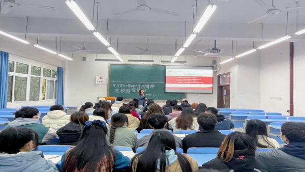 为引导新时代青年延续党的百年奋斗历程,传递党的二十大声音,加强当代大学生的政治理论学习,经济管理学院团总支·学生会于2022年12月6日中午12:30在经济管理学院大楼405顺利开展学习党的二十大精神进校园宣讲会,本次宣讲会由经济管理学院团总支书记龚宇梦主讲,采用线上和线下相结合的方式开展,团学全体成员参加。