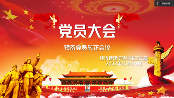 为进一步加强党员队伍建设,增强党员党性修养,切实提高党员发展质量,壮大支部党员队伍,12月14日中午,经济管理学院学生第三党支部召开预备党员转正大会,讨论关于刘海艳、李宏伟等13名同志如期转正事宜。支部书记唐继龙及支部全体党员参加会议,本次会议由唐继龙书记主持。