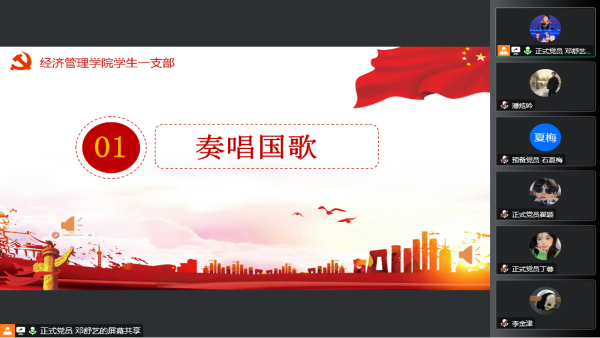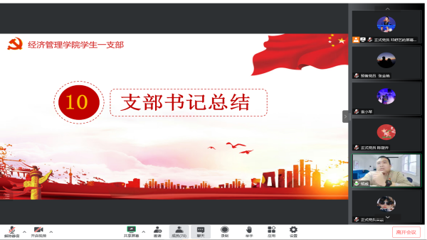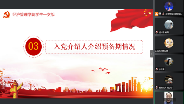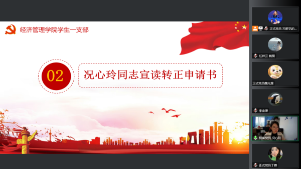 为加强党员队伍建设,优化党员队伍结构,积极稳妥地做好新形势下发展党员工作。12月17日中午,经济管理学院学生一支部于线上(腾讯会议)召开预备党员转正大会,讨论关于况心玲同志的转正事宜,支部书记胡威、副书记袁小琴及全体党员参会,本次大会由邓舒艺同志主持。
