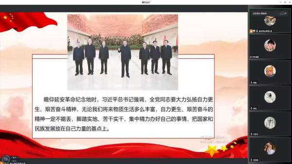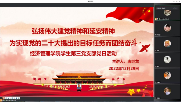 为深入开展党史学习教育,进一步推动新时代大学生继承和弘扬延安精神,从红色革命精神中汲取力量,不忘时代初心与使命。12月29日中午,经济管理学院学生第三党支部于线上(腾讯会议)开展以“弘扬伟大建党精神和延安精神,为实现党的二十大提出的目标任务而团结奋斗”为主题的党日活动,支部书记唐继龙及支部全体党员参加,此次活动由支部书记唐继龙主持。