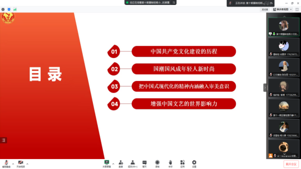 为进一步传承和发展中华优秀传统文化,准确把握时代需求,不断引导青年学子在学以致用中坚定文化自信、在知行合一上增强历史自觉,始终把建设中国先进文化视为己任,全面推动中国传统文化活起来、传下去。1月19日中午,经济管理学院学生党员骨干班暨入党积极分子骨干班于线上(腾讯会议)开展以“坚守文化自信,建设文化强国”为主题的集中理论学习。本次理论学习由张佳莹同学主持,杨小文同学主讲,骨干班全体成员参加。